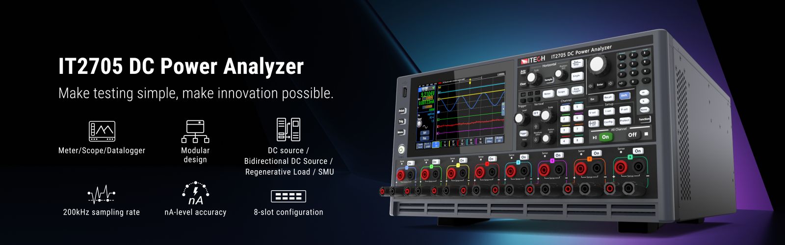 Az IT2705 egy magas szinten integrált, moduláris DC teljesítmény analizátor, amelyet kifejezetten akkumulátorok tesztelésére fejlesztettek ki, alapos kutatásokra alapozva a tápegységek területén. Egyesíti a DC tápegységet, az elektronikus terhelést és a tetszőleges hullámforma-generátort egy intuitív grafikus felhasználói felülettel (GUI), támogatja az oszcilloszkópos mintavételezést és az adatnaplózást is, lehetővé téve összetett tesztelési folyamatok létrehozását másodlagos fejlesztés nélkül.